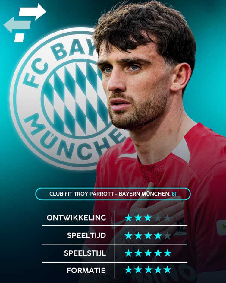 Bayern München staat erom bekend dat ze een goed transferbeleid voeren, waardoor er ongetwijfeld al opvolgers voor Harry Kane in beeld zijn. Op basis van data van SciSports lijkt Troy Parrott namelijk een geschikte opvolger. De huidige spits van AZ scoort namelijk een Club Fit van 81 met Die Bayern in de Career Advice Tool.