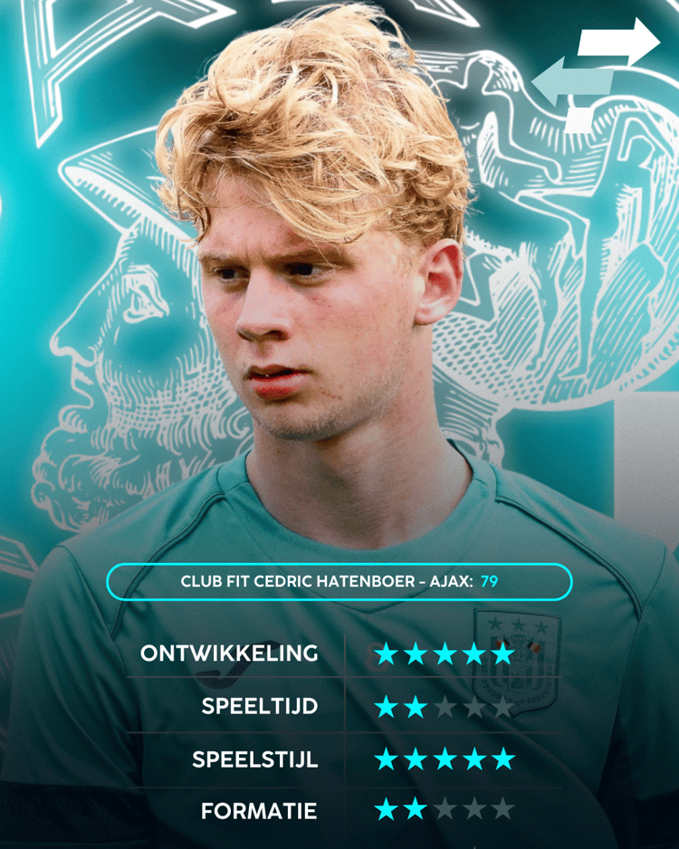 De Career Advice Tool van SciSports wijst namelijk uit dat Hatenboer een Club Fit van 79 heeft met Ajax. Vooral qua ontwikkeling en speelstijl past de jonge middenvelder goed bij de Nederlandse recordkampioen. Qua speeltijd scoort hij nu wat minder, wat gezien de vele opties op het middenveld van Ajax niet onlogisch is. Met een vertrek van spelers als Kenneth Taylor, komt er vanzelf meer uitzicht op speelminuten. Als aan het eind van dit seizoen de huurperiode van James McConnell afloopt, komt er ook alweer een plek vrij.