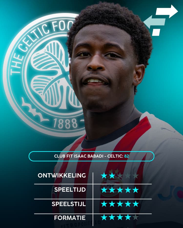Voor Isaac Babadi lijkt het daardoor uitgesloten dat hij na zijn verhuurperiode bij Royal Antwerp voor een nieuwe kans bij PSV gaat knokken. In dat geval biedt een transfer naar Celtic uitkomst. Uit de Career Advice Tool van SciSports blijkt namelijk dat hij een Club Fit van 82 heeft met de Schotse recordkampioen. Bij Celtic heeft Babadi uitzicht op veel speelminuten, terwijl de speelstijl en de formatie van de topclub ook goed aansluiten bij de middenvelder.