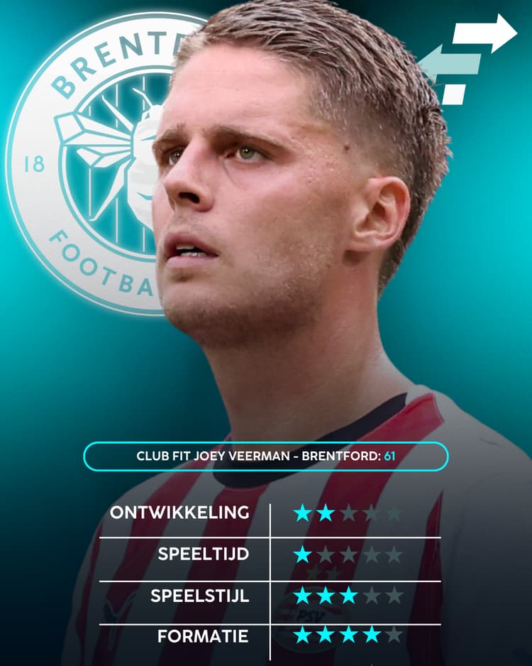 Vereman zou zelf echter ook zijn twijfels moeten hebben bij een overstap naar Brentford. Data van de Career Advice Tool van SciSports wijst namelijk uit dat de middenvelder een Club Fit van slechts 61 heeft met de club uit Londen. Er lijkt voor hem weinig uitzicht te zijn op speelminuten, terwijl ook de speelstijl van Brentford niet echt bij Veerman lijkt te passen. Indien PSV toch mee wil werken aan een vertrek, lijkt het Veerman zelf te zijn die de transfer in twijfel moet gaan trekken.