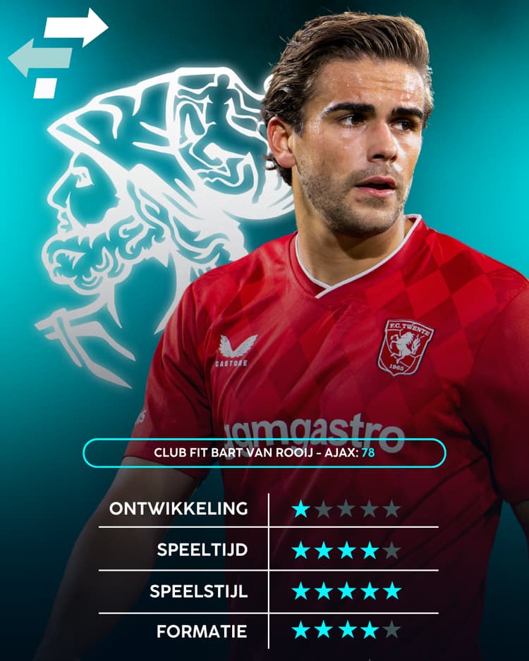 De gelijkenis tussen Anton Gaaei en Bart van Rooij lijkt niet de enige reden te zijn waarom Ajax aan moet kloppen bij FC Twente. De rechtsback van de Tukkers blijkt namelijk ook goed bij de Amsterdammers te passen. Uit de Career Advice Tool van SciSports blijkt namelijk dat Van Rooij een Club Fit van 78 scoort met Ajax, waar hij voldoende aan spelen lijkt te kunnen komen en de speelstijl en formatie ook aansluiten.