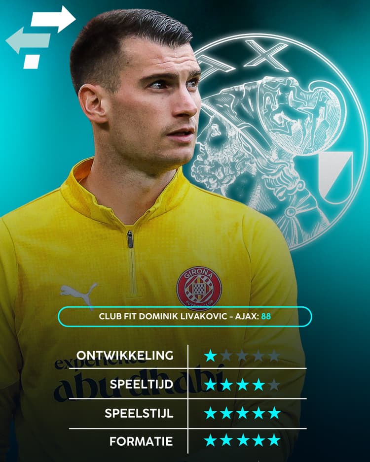 De problemen met de keepers kunnen echter opgelost worden. Dominik Livakovic wordt momenteel door Fenerbahçe verhuurd aan Girona. De Kroatische doelman zou echter ontevreden zijn met zijn hoeveelheid speelminuten en hopen op een nieuwe club. Volgens data van SciSports kan Ajax dan uitkomst bieden. Livakovic heeft volgens de Career Advice Tool namelijk een Club Fit van 88 met de Amsterdammers, waar hij wel op genoeg speeltijd kan rekenen. Met een Skill van 62,4 zou hij ook meteen de beste doelman van Ajax worden.