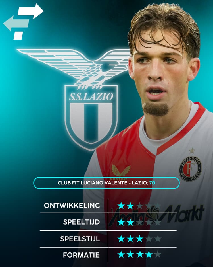 Een transfer naar die club lijkt dan ook een absolute droomtransfer te kunnen zijn voor Valente en de rest van zijn familie. Toch is een vertrek naar de Italiaanse hoofdstad voorlopig nog geen goed idee. De Career Advice Tool van SciSports wijst namelijk uit dat Valente een Club Fit van 70 heeft met Lazio. Daarbij valt op dat hij zich weinig zal ontwikkelen, niet veel aan spelen lijkt toe te komen en dat ook de speelstijl niet helemaal aansluit.
