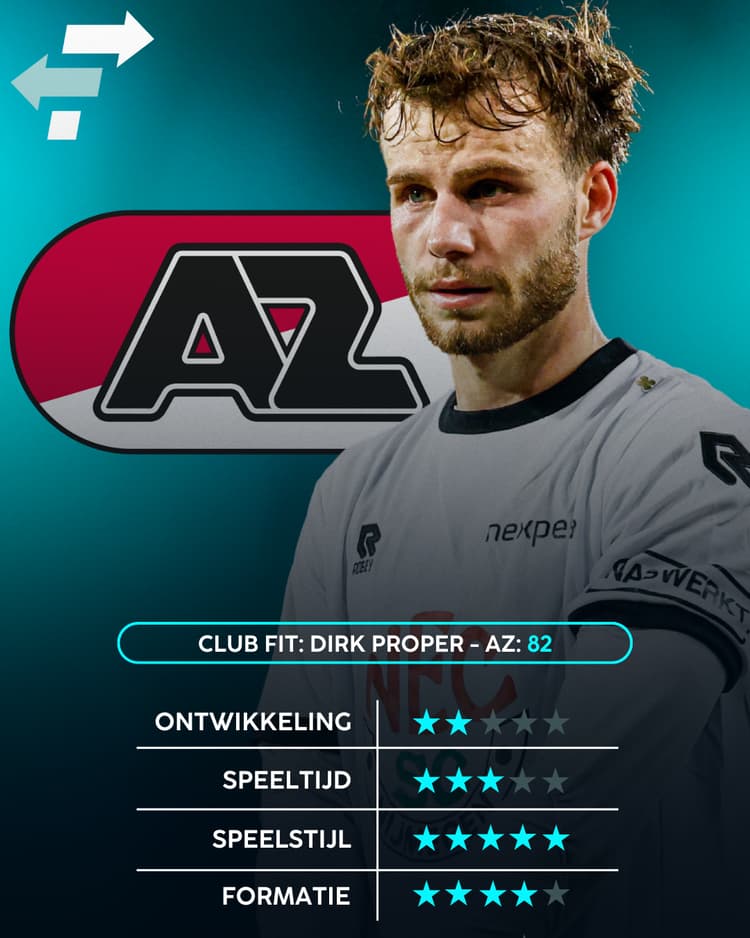 In Alkmaar lijkt men dan ook rekening te moeten houden met een sterk uitgedund middenveld. Om trainer Maarten Martens van voldoende mogelijkheden te voorzien, is het verstandig om de markt op te gaan. Dirk Proper van NEC blijkt uit data van SciSports de ideale keuze te zijn voor AZ. De middenvelder scoort in de Career Advice Tool namelijk een Club Fit van 82 met de Alkmaarders. Vooral de speelstijl en formatie sluiten goed aan en dragen bij aan de hoge score.