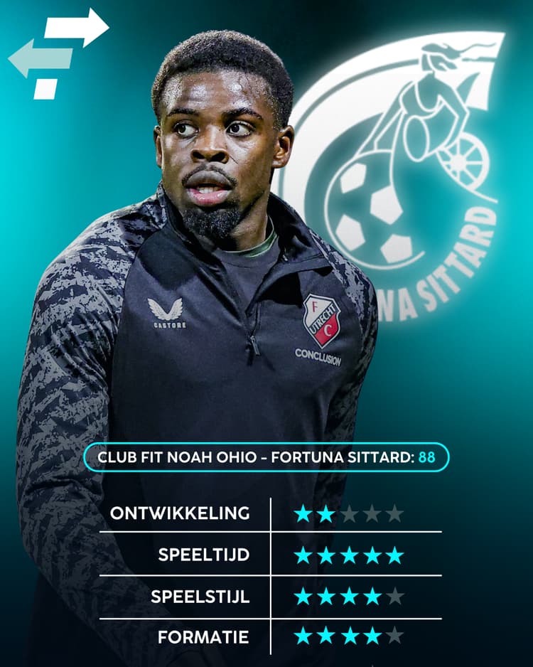 Noah Ohio zit bij FC Utrecht al lange tijd op een zijspoor. De spits lijkt niet meer in aanmerking te komen voor het eerste elftal, al liet Ron Jans doorschemeren dat hier mogelijk verandering in komt. Een transfer lijkt echter nog altijd de beste optie. Fortuna Sittard is op basis van data van SciSports de beste keuze voor Ohio.
