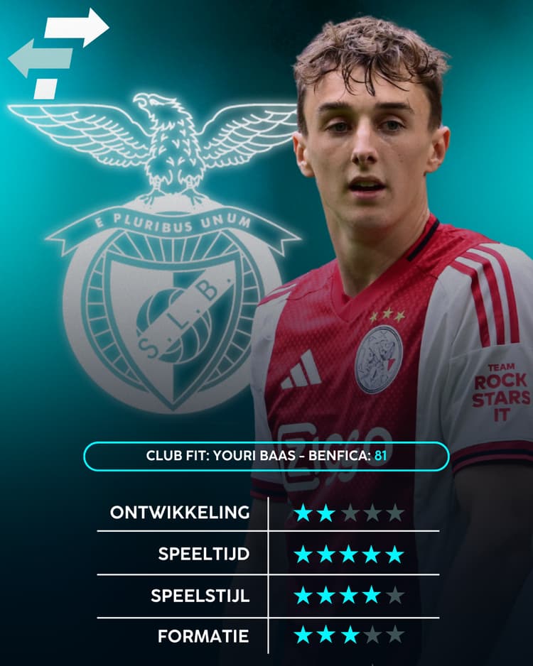 Ajax trof onlangs in de Champions League nog het Benfica van trainer José Mourinho. De Portugese succescoach lijkt op basis van data van SciSports een stokje te moeten steken voor de transfer van Youri Baas naar Engeland. Uit de Career Advice Tool van het data-analysebureau komt namelijk naar voren dat Benfica een Club Fit van 81 heeft met de Ajax-verdediger, voornamelijk doordat er genoeg uitzicht is op speelminuten en ook de speelstijl goed aansluit.