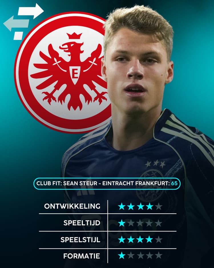 Data van FootballTransfers wijst uit dat Sean Steur nog wel flink door kan groeien. De middenvelder beschikt momenteel over een Skill-rating van 47.6, maar kan nog doorgroeien tot een Skill-rating van 71.0. Die ontwikkeling kan hij bij Eintracht Frankfurt simpelweg moeilijker doorzetten dan bij Ajax, waar de jongeling momenteel genoeg kansen krijgt.