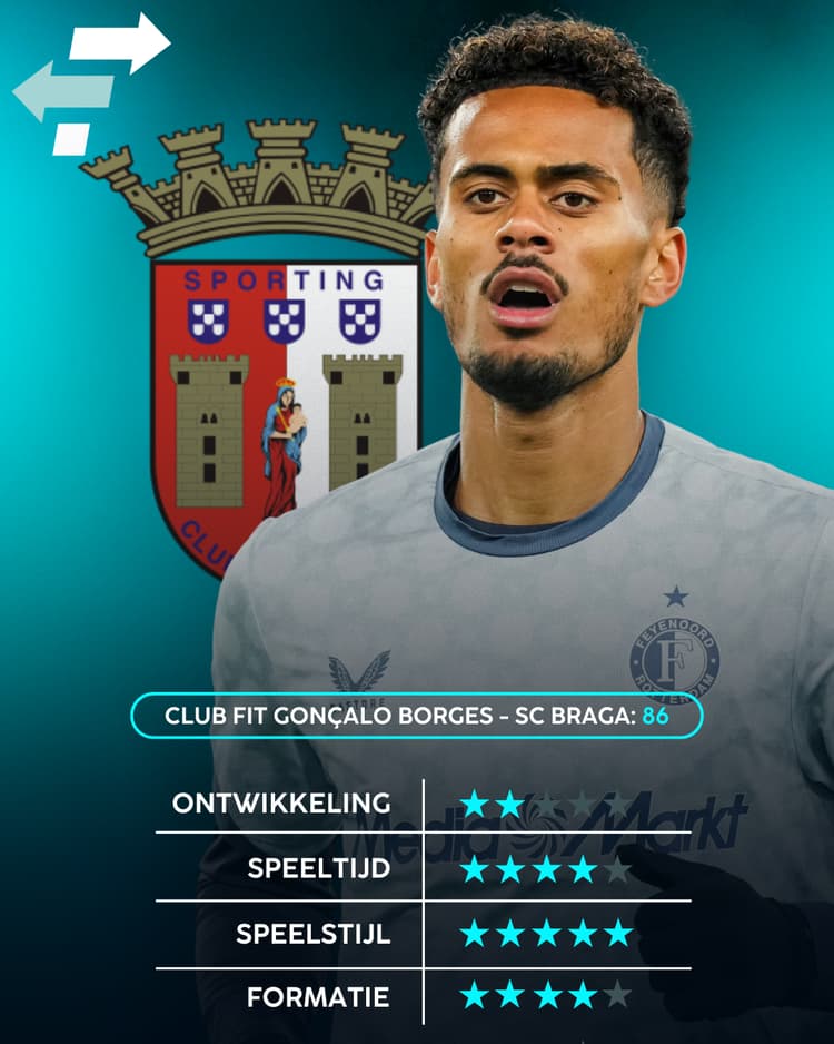 Feyenoord legde afgelopen zomer een recordbedrag op tafel voor Gonçalo Borges. De Portugese vleugelaanvaller weet in Rotterdam echter allerminst te overtuigen en lijkt nu al niet meer in aanmerking te komen voor speelminuten. Een transfer lijkt voor beide partijen het beste te zijn en volgens data van SciSports kan een terugkeer naar Portugal bij SC Braga uitkomst bieden.
